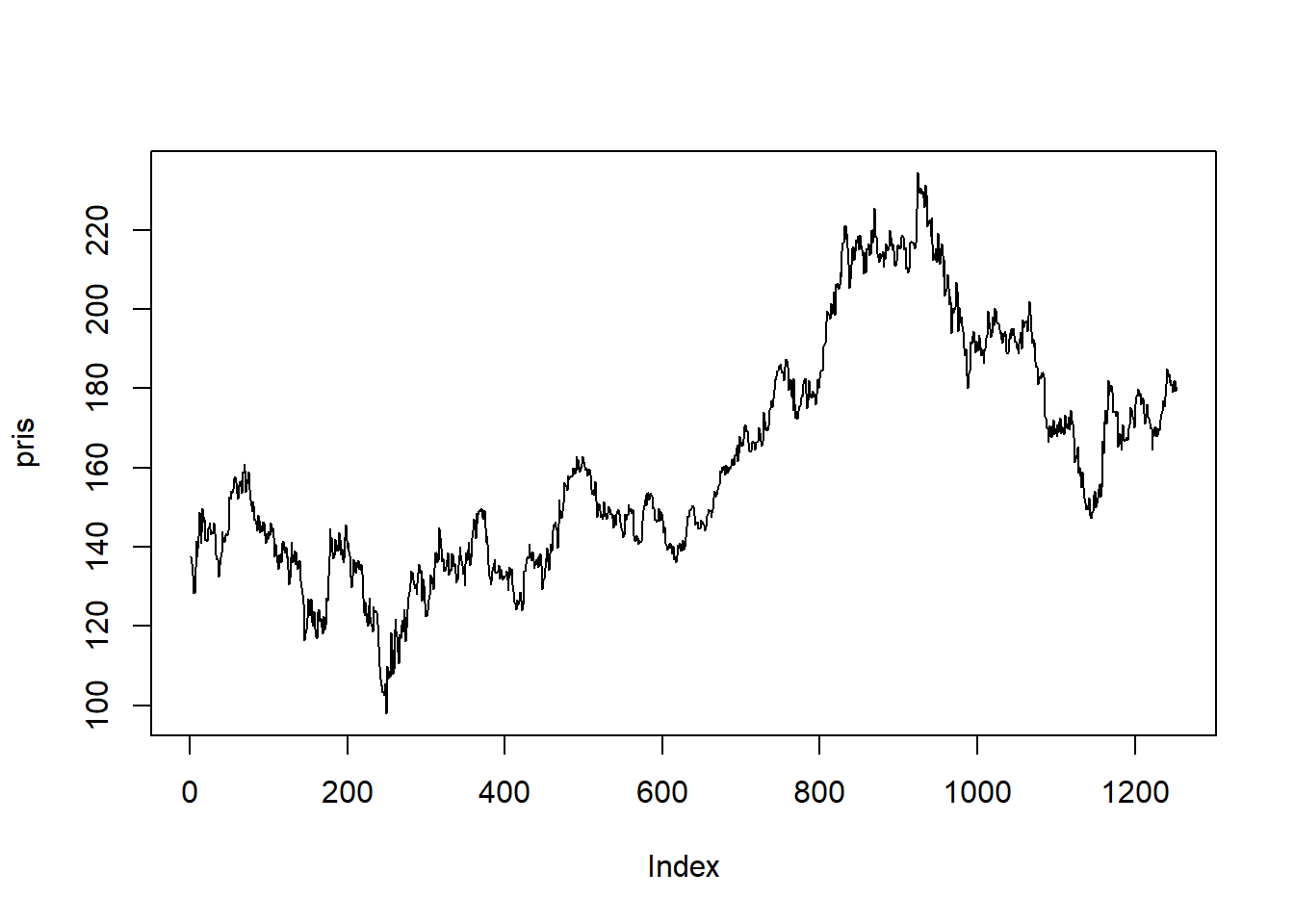 Vi tar en ny titt på den daglige prisen på Eqinoraksjen over en 5-års periode som vi så på i introduksjonen til tidsrekker. Vi laster inn datasettet som før ved hjelp av readxl-pakken, og henter ut den aktuelle kolonnen. Legg merke til at vi bruker rev()-funksjonen til å reversere rekkefølgen til observasjonene slik at den første verdien komme først: