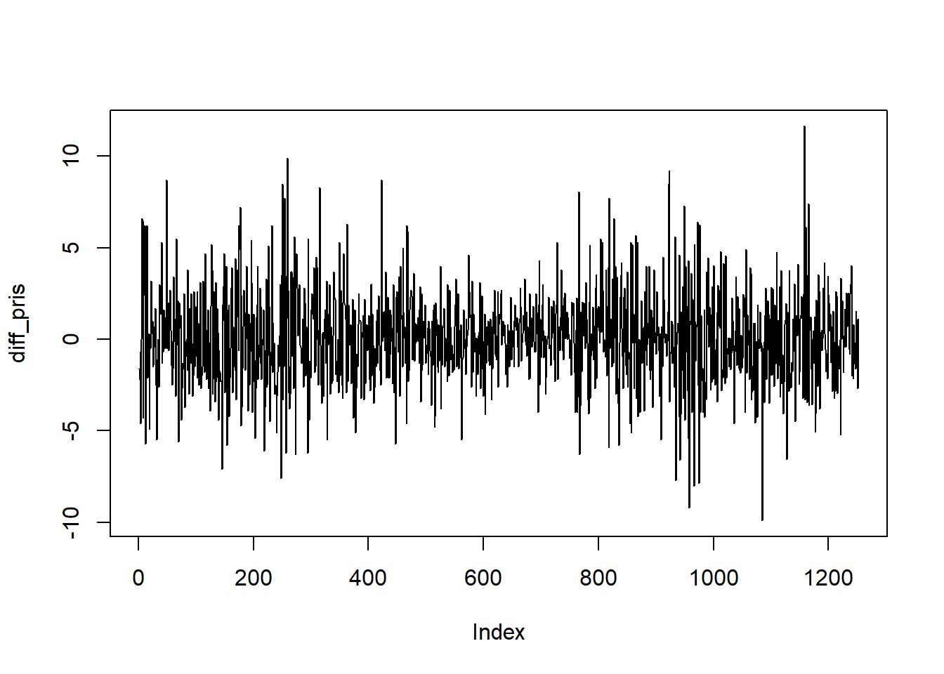 I forhold til prisen ser den differensierte prisen stasjonær ut og det er derfor rimelig med en ARIMA model. I et effisient marked skal prisen i teorien følge en tilfeldig gang slik at den differensierte tidsrekken bare er støy, altså at prisen følger en ARIMA(0, 1, 0) modell.
