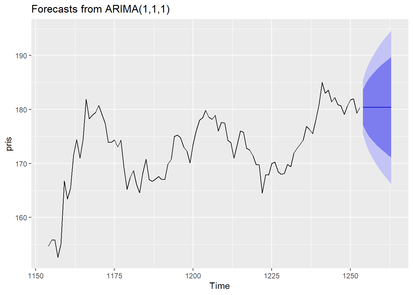 Kommentar: I et effisient marked skal prisutviklingen i teorien følge en tilfeldig gang og dagens pris vil da være det beste du kan tippe på for morgendagens pris. Vi ser her at dette blir reflektert i prediksjonen gjort av Arima(1,1,1) modellen.