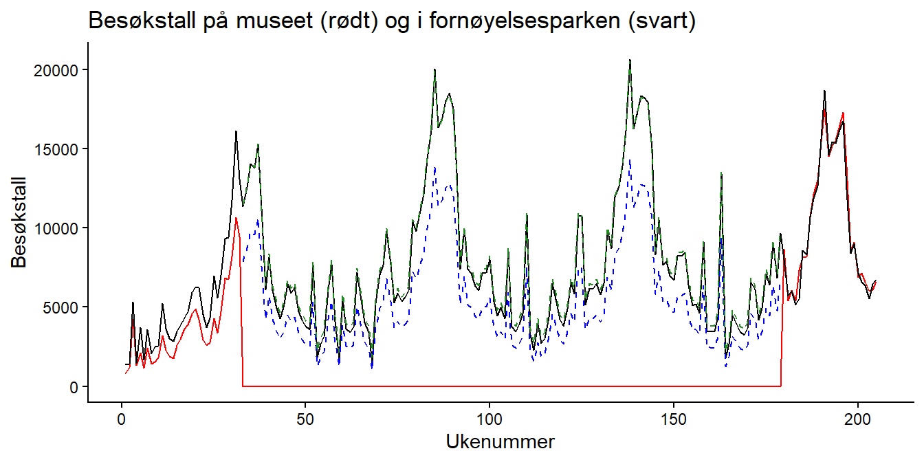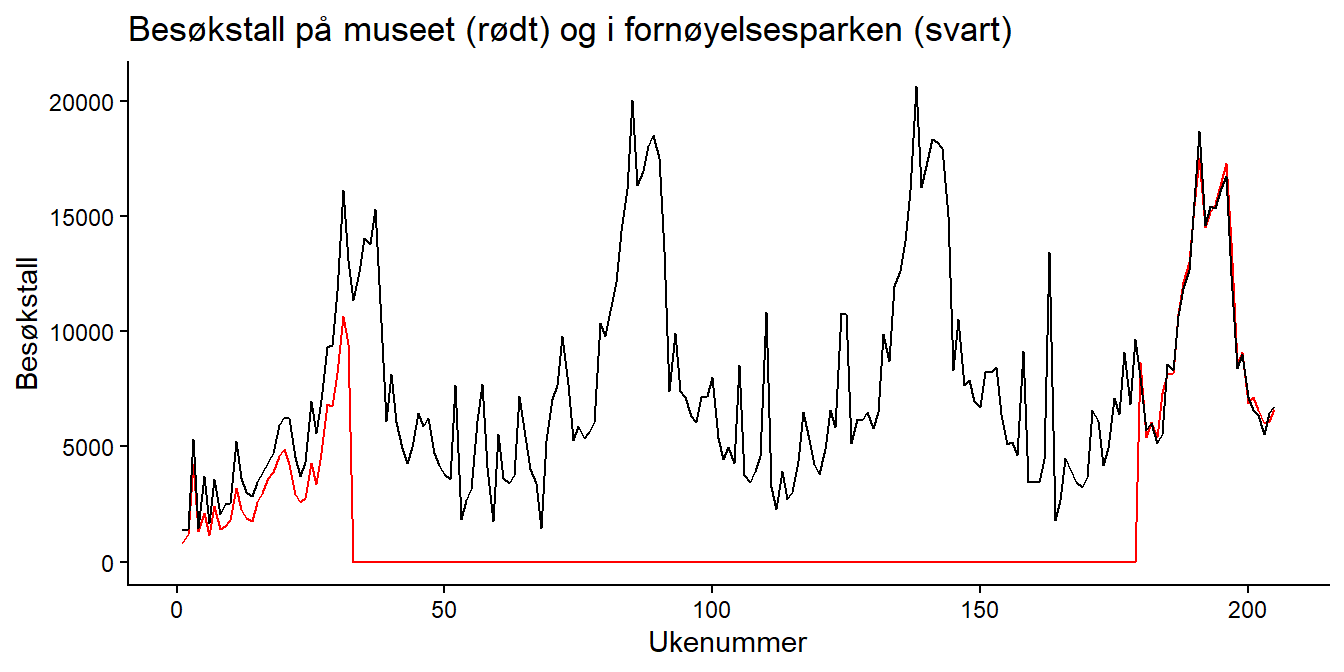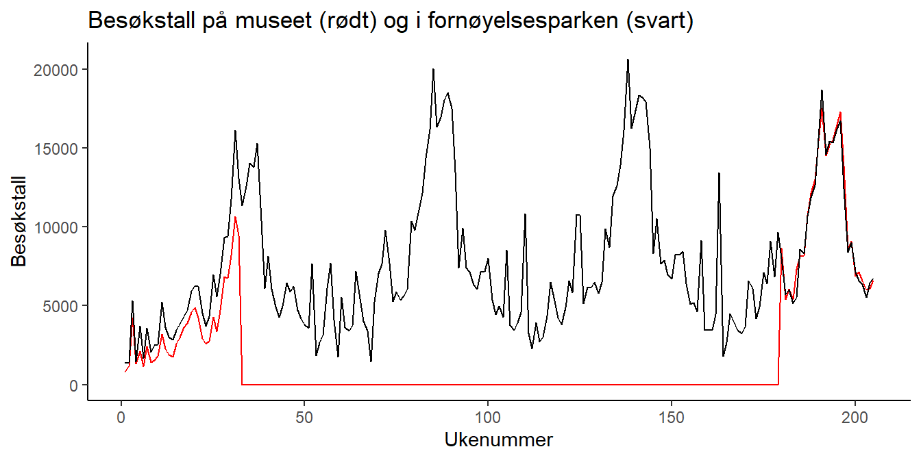 Du kan legge til besøkstall for fornøyelsesparken ved å plusse på en ny linje med geom_line(), men da må du spesifisere y-variabelen på nytt. Hele plottekommandoen blir da: