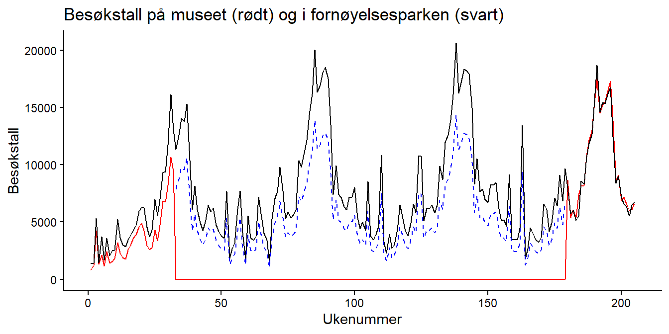Museet åpnet igjen i april 1995, men var da betydelig større enn det var opprinnelig. Data for besøkstall for museet og fornøyelsesparken finner vi i regnearket C16-01.xlsx. Som i de to foregående dataøvingene legger du denne filen i en mappe på maskinen din, og oppretter et tomt R-script der du lagrer koden for denne oppgaven.