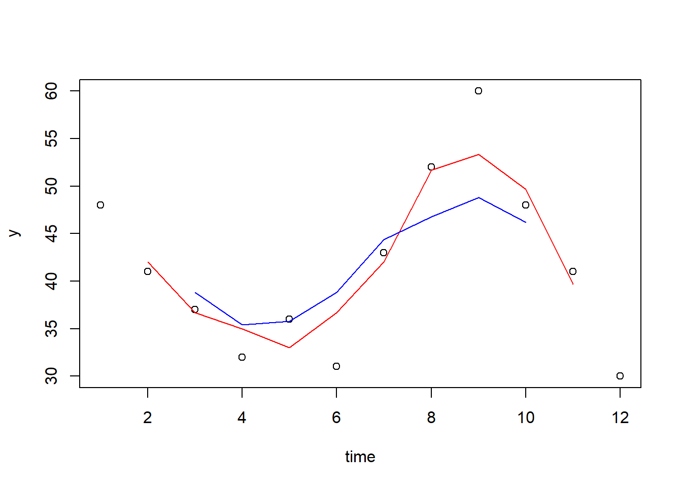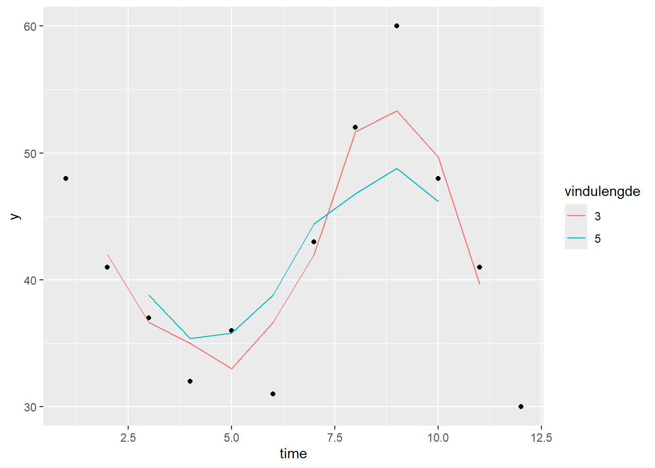 Da får vi ut en ny vektor med lik lengde som den vi hadde, og som inneholder den glattede versjonen. Den fyller opp verdiene i starten og slutten som vi ikke kan regne ut med et glidende gjennomsnitt med NA, slik at vi kan tegne inn den glattede versjonen i samme plott som vi viste selve tidsrekken: