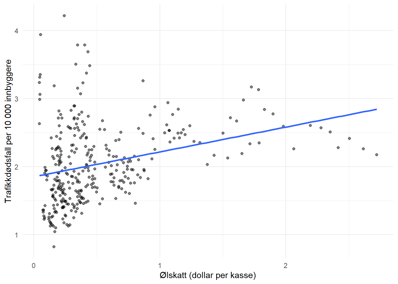 Spredningsplottet viser en positiv sammenheng mellom ølskatt og trafikkdødsfall — overraskende og kontraintuitivt.