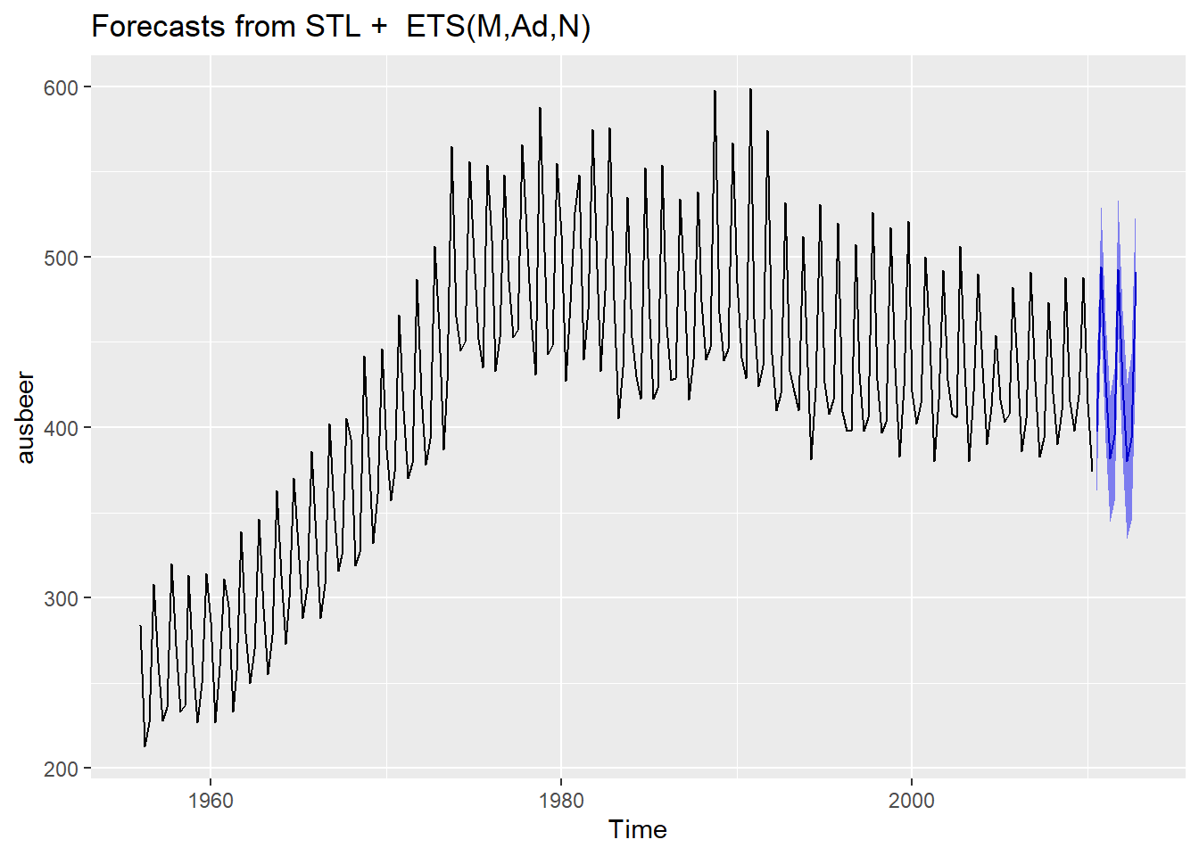 1. Data. I pakken fpp2 finnes en tidsrekke som heter ausbeer, som er den kvartalsvise produksjonen av øl i Australia fra 1956 til 2008. Du kan få tak i det og se på tidsrekken ved å kjøre følgende kommandoer: